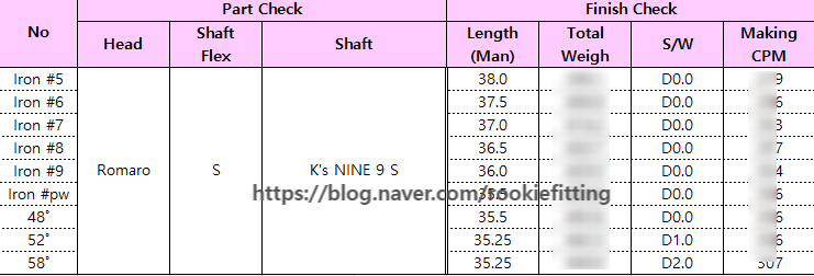 샤프트 무게, 원소재 CPM 수치등을 기록하고